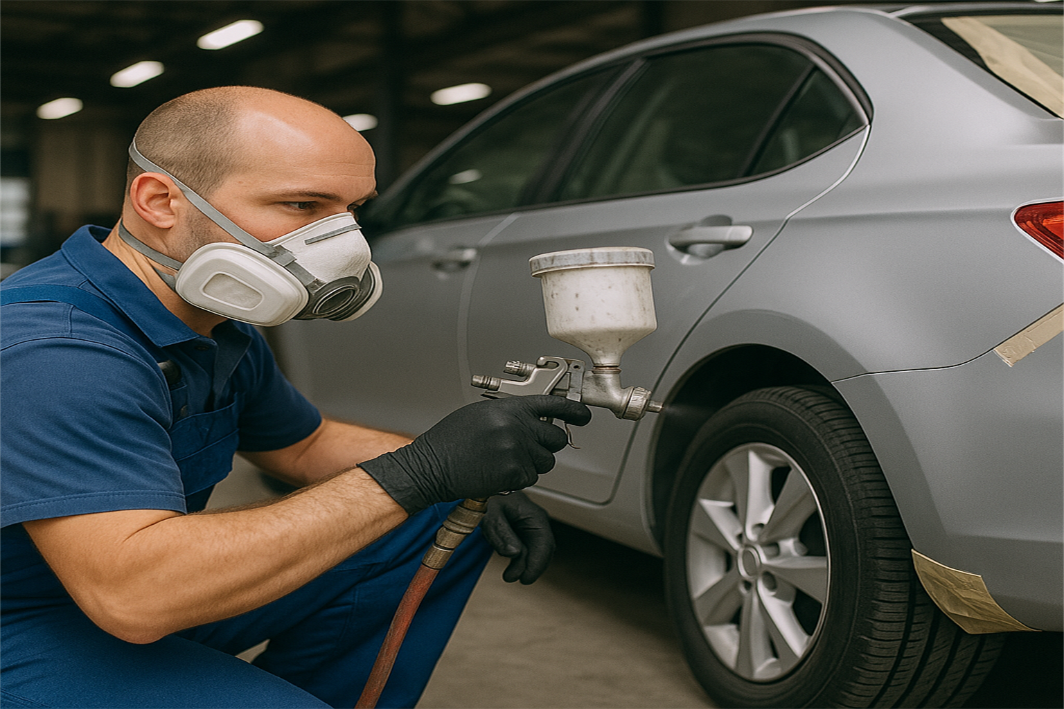 The vehicle's body is repaired by fixing dents, structural damage, or replacing damaged panels. The vehicle is sanded, primed, painted, and clear-coated to restore its original appearance.